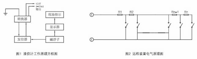 液位遠(yuǎn)傳裝置亦是根據(jù)磁鋼特性通過干簧管組及轉(zhuǎn)換器將液位的變化轉(zhuǎn)換成4~20mA標(biāo)準(zhǔn)信號,進(jìn)行遠(yuǎn)傳實(shí)現(xiàn)液位的測量、記錄和控制。如圖1、2所示