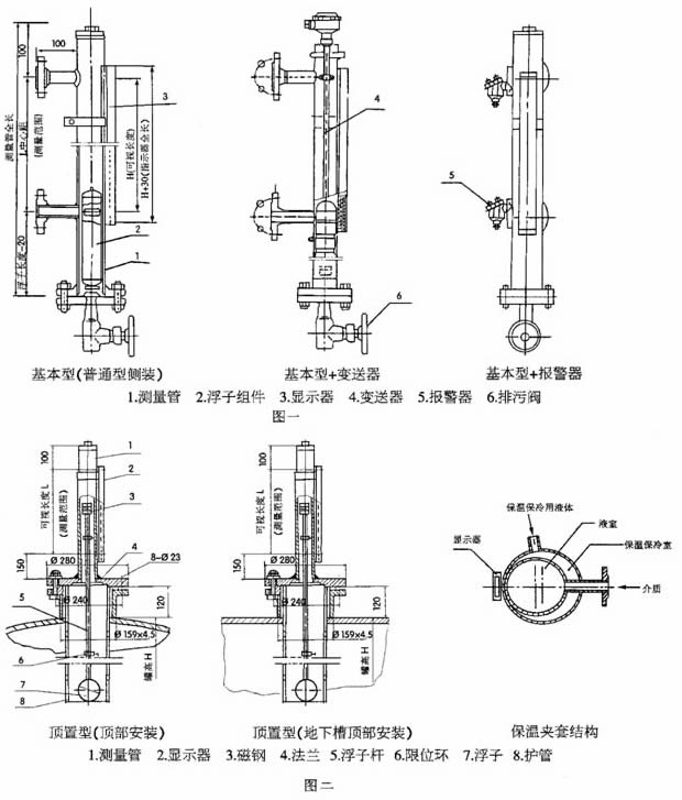 UHZ系列磁浮子按其功能可分為:基本型(現(xiàn)場指示型)、帶上、下限報(bào)警器型及變送器型三種。如圖一所示。頂部安裝或地下槽頂部安裝如圖二所示。按其參數(shù)來分有:基本型、高溫型,高壓型,防腐型、防霜型及保溫夾套型